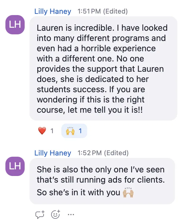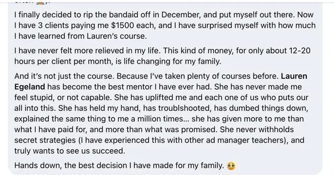 "I took the Profitable Ad Manager course and LOVED IT! I was first hesitant because my experience is primarily in Human Resources and thought I needed years of marketing experience before diving into starting my own Facebook Ad business. Lauren provided the resources that I needed to learn about Facebook Ads. Her 1-on-1 coaching helped me build the confidence to get my business running and reach out to potential clients. What makes the Profitable Ad Manager program even sweeter deal is that you have lifetime access to join future group calls!" - Jackie D